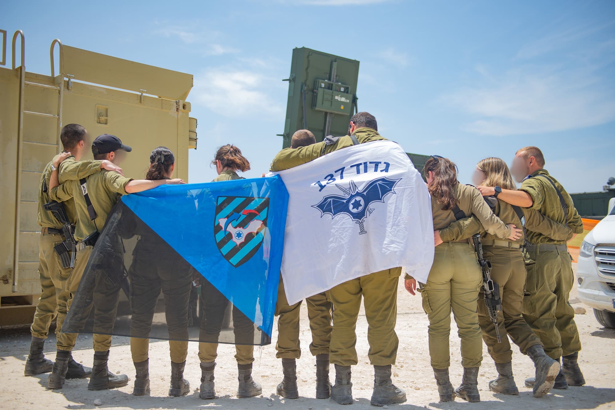 The insignia, a bat, is derived from the latest acquired German radar called Superfledermaus (Super Bat). The incoming red arrow symbolizes any projectile headed to the country being countered with an outgoing blue arrow directly towards it. When the Unit was transferred to the Air Force in 1970, diagonal stripes (blue and black) were added in order to symbolize [cooperation] between the Air Force and the land forces. The latest insignia was designed in 2011 by graphic designer Yigal Gabbay.