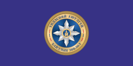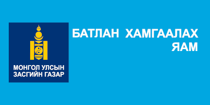 Ministry of Defence flag is blue with a dark blue panel at the hoist, where soyombo emblem and inscription “Government of Mongolia” with Mongolian Cyrillic script are placed. The inscription “Ministry of Defence with Cyrillic script is placed on upper part of the Rest part of the flag