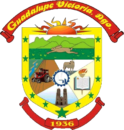 The old coat of arms had two corn plants at its sides for agriculture. At the bottom, three ribbons reading its name, "Guadalupe" "Victoria, Dgo." and "1921", when the community started to be settled. A plant sprouts from a ribbon, probably a tobacco plant. As for the inner section of the shield: At the top is the local Orthodox church, having two clouds at its sides raining remembering the importance of water. To the left side, a man ploughing his fields with cattle and to the right, with a tractor; this reminds us of the technological advances in agriculture. The lower designs are contained in a triangle. Above is a cow and its baby. Below, a cob of corn and bag of beans reading "100 Kg Frijol" on it.