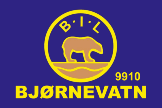 The flag of Bjørnevatn IL (Bjørnevatn Idrettslag) from Bjørnevatn in Sør-Varanger Municipality is blue or chequered blue and yellow with the badge centered.