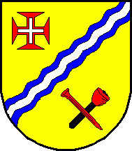 on sinister base a stonecutter´s hammer Gules hafted Sable in bend sinister under a chisel Gules in bend.