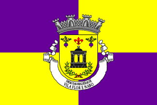 Shield Or a vault dome on three columns Sable, on chief a fleur-de-lis Gules flanked by two turnips Purple leafed Vert, on base two olive branches Vert fructed Sable with their proximal tips in saltire and tied Gules. Mural crown Argent with four visible towers (town rank) and white scroll reading in black upper case serifed letters "UNIÃO DAS FREGUESIAS DE VILA FLOR E NABO" set in two unequal lines, the lower reading the simple toponym in larger size.