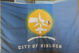 The flag has a blue background. City of Kinloch is written in white letters at the bottom. Above that it says "heaven helps those that help themselves." The city seal is a yellow circle with green leaves all around it. Inside the city seal is a white building representing the Kinloch city hall, an open book, four large leaves, and a hand holding a piece of paper that says vote.