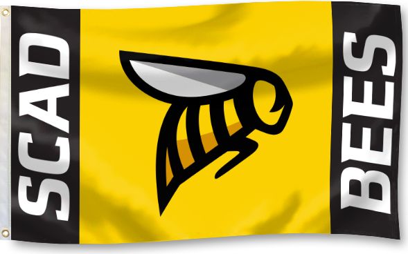 The flag is horizontally banded black-yellow-black, ratio 1-2-1, fimbriated white, with the letters SCAD in black on the yellow band.