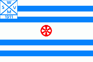 It was a white flag parted by two pairs of blue horizontal stripes, between the stripes on centre was a red 6-spokes wheel. There was a white canton with blue edges parted b a thin blue saltire with blue inscriptions on every quarter as follows: "W"(top), "S"(hoist), "V"(fly) and "M"(bottom), beneath annexed was a white rectangle with blue edges and blue inscription "1911".