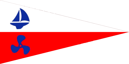 The pennant is The pennant is horizontally divided of white and red. At hoist is a blue sailing ship above and a blue ship propeller below.