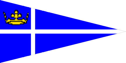 The pennant is dark blue, shifted to hoist is a stylised yellow crown above from three wavelets yellow.
