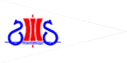 The pennant is horizontally parted of wite over blue. Shifted to hoist is a logo, a blue sailing ship over blue waves, surrounded by a blue annulet charged with the name in white initials.