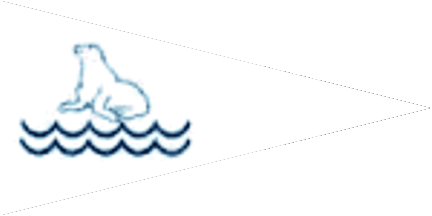 The pennant is white. Shifted to hoist is a sitting blue seal over two blue wavy lines.