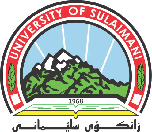 The logo depicts underneath the university name in Arabic. In a mostly circular format, the bottom ends where a golden book is placed (having as its pages the fields for agriculture), and above it the year 1968 of its foundation. The circle is outlined in black, white, red, white, then black. Over the red ring is a crop and white rectangle on both sides, and the text UNIVERSITY OF SULAIMANI is read. In the center of the circle is a blue sky background from which sun rays emerge behind a green mountain topped in snow.