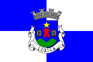Shield Azure a cuirass (Portuguese:loriga or >lorica) Or, flanked by two watermill wheels Or, in chief a 5-point estoile Or, on a mound of two coupeaux Argent issuant from base a barrulet gemel wavy Argent. Mural crown Argent with four visible towers (town rank) and short white scroll, in Bénard Guedes style, reading in black upper case serifed letters "LORIGA".