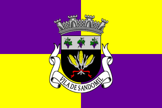 Shield Sable three maize ears Or leafed Argent and tied at their stems by a ribbon Gules, on chief Argent three grape bunches Purple leafed Vert Mural crown Argent with four visible towers (town rank) and white scroll reading in black upper case serifed letters "VILLA DE SANDOMIL".