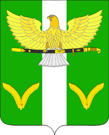 On a green field with a narrow silver column, above everything, at the top, there is a golden eagle with outstretched wings and a silver tail, holding in its claws a Cossack saber with a golden hilt in a black, gold-decorated scabbard, with the hilt to the left and the blade down, accompanied in greenery below by paired soybean pods, connected at the base and diverging archedly upward and to the sides.