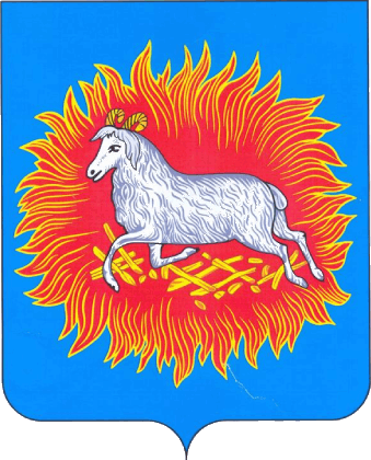 In an azure (light blue) field, a silver ram with golden horns, lying on golden brands; everything is engulfed in gules (red) with a thin golden border of flame.