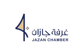 The flags of Jazan Chamber are white with the logo and name.