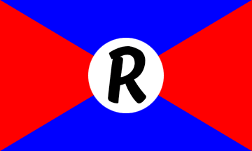 It is a red swallow tail pennant with a white bordure at three sides. In the red filed shifted to the hoist is a white, serifed capital "R".