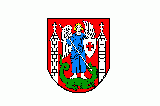 Shield Gules an angel statant Argent, haired Or, dressed Azure and winged Argent, holding a shield Argent charged with a cross patty Gules