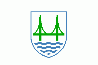 Shield Argent with bordure Azure a suspension bridge Vert, on base waves Azure.