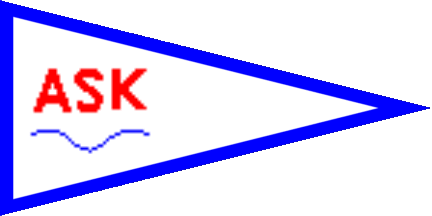 The pennant is horizontally divided of white and red. At hoist is a blue anchor in bend above and a white inscription "ASK" below.