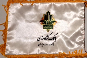 A white-field desktop flag of the "Bank Keshavarzi" (Persian: بانکِ کشاورزی, "Bānk-e-Keshāvarzi"), (meaning: "Bank of Agriculture") also known as "Agribank", is a major Iranian banking establishment offering retail and commercial services. The company was established in 1933 as a "Farming and Industrial Bank." Currently, the bank serves as the only specialized financial institution in the agricultural sector that holds over 1,800 branches nationwide and finances nearly 70% of the Iranian agricultural sector. The top line reads: "Bank Keshavarzi" and the second line reads: "Bank Hameh Mardom Iran"; c. Dec. 2025. The hoist is at the right side.