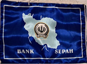 A blue-field desktop flag of Iran's "BANK SEPAH" with the bank's logo inside an image of Iran; c. Dec., 2025. The hoist is at the right side.