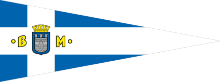a white offset cross on which is the arms and letters B and M.