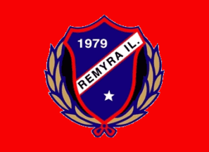 The flags of Remyra IL (Remyra Idrettslag) from Stjørdal are red or black with the badge centered. A red over black horizontal bicolor was also found with the badge in the upper fly