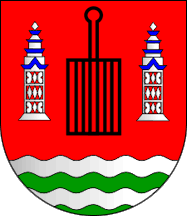 The gridiron is an attribute of St. Lawrence, the local patron saint. The base wavy is a representation of the Atlantic Ocean. The chimneys are typical local buildings.