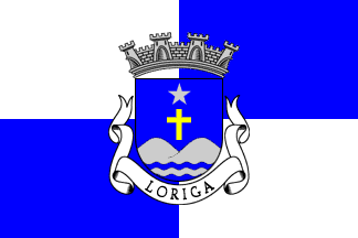 Shield Azure a cuirass (Portuguese:loriga or >lorica) Or, flanked by two watermill wheels Or, in chief a 5-point estoile Or, on a mound of two coupeaux Argent issuant from base a barrulet gemel wavy Argent. Mural crown Argent with four visible towers (town rank) and short white scroll, in Bénard Guedes style, reading in black upper case serifed letters "LORIGA".
