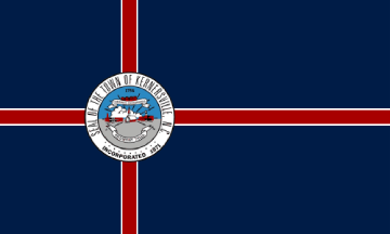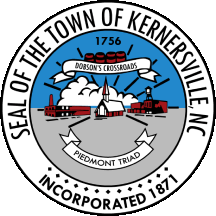 The flag is a dark blue field with a Nordic cross of red with white outlines. At the point of intersection is the Seal of the City of Kernersville.