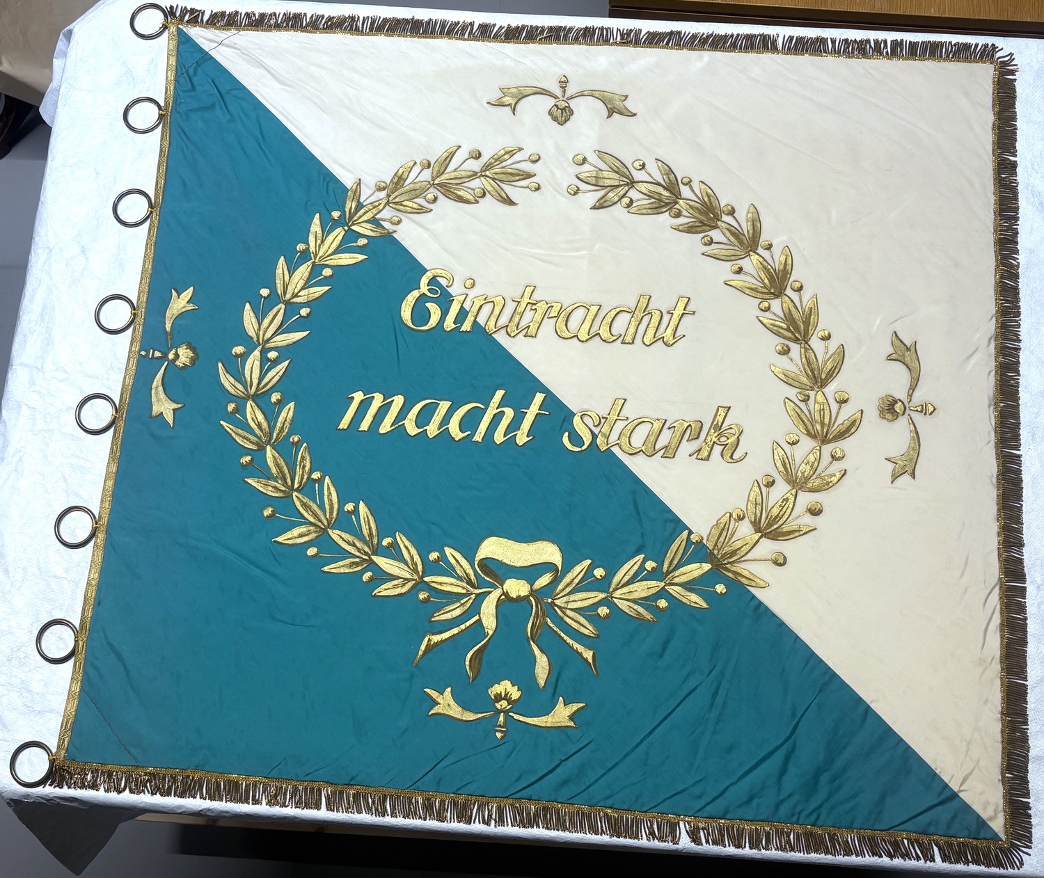 The jubilee books from 1935 [1] and 1985 [2] report that Louis Napoleon's mother Hortense de Beauharnais had embroidered the words "Eintracht macht stark" (harmony makes strong) on the flag (see photo of obverse side). –