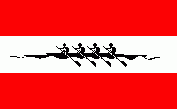 It is a red-white-red horizontal triband. On white stripe is a stylised black rowing boat with four rowers.