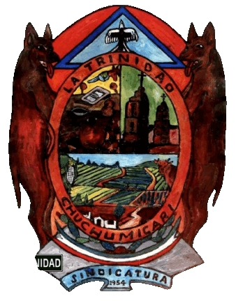 The coat of arms of La Trinidad was designed by Juan Nazario Sañudo Sepulveda. To the sides are wolves as supporters. At the top is a triangle probably for the Holy Trinity with a dove within it over a red oval. At the bottom is a pedestal with a cactus and ribbon in the national colors representing the Nationality; below SINDICATURA 1954 is read, when it became one. The border reads LA TRINIDAD at the top and CHUCHUMICARI at the bottom, the hacienda that existed here. As for the inner sections: to the upper-left different tools are shown to represent processing, and to the upper-left the church of La Santisima Trinidad is shown. At the bottom, an image of the valley with trees, a path, houses, cattle, and corn, and hills are seen.