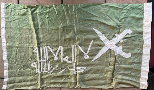 I inherited this flag from my mother-in-law who worked for ARAMCO in Saudi Arabia after WW2. She brought back a few artifacts. It's darker green on the back side and appears to have been hand sewn.