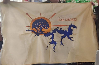 The flag was unveiled in January of 2025, and were designed by local Rod Olguin. It was the result of a flag contest held in late 2024 by the Oak Shores Property Owners Association. The flag is a beige field with a depiction of Lake Nacimiento, also known as Dragon Lake due to it's shape. On the left side of the lake is an oak tree, which the community is named after, along with it being on the shores of the lake. The tree marks the community's location on the lake. Behind the tree is the sun with five orange rays emanating from it. On the right side of the lake is the community name in orange.