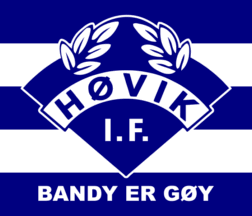The flags of Høvik IF (Høvik Idrettsforening) from Høvik in Bærum Municipality are white or blue and white striped with the badge centered.