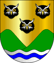 Shield Or three owls caboshed Sable garnished Argent and animated Or, in base a mound of two coupeaux Vert issuant from flanches and from a base wavy Argent charged with a barrulet wavy Azure.