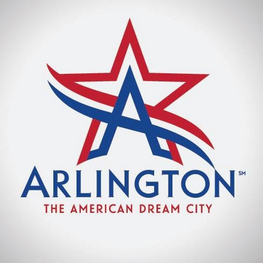 The city’s logo is a large stylized letter A, composed of two broad strokes on either side that extend outwards, resembling two hockey sticks back to back. The hoist stroke is dark blue, the fly stroke is red. In place of a crossbar for the "A" is a five-pointed star divided vertically in half: the hoist side red, the fly side dark blue. The lettering is an unusual sans-serif font; the letter "i" is not dotted in City or Arlington, and the "C" and "i" in "City" are joined.
