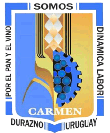 It is not clear when the municipality adopted its coat of arms and its designer, but certainly before 2013. The coat of arms is a shield, with its edge having a blue block in each corner and at the bottom point. In the spaces in between, black text is read: at the top SOMOS [We are]; to the left POR EL PAN Y EL VINO [For the Bread and the Wine; it is known for its bread and wine]; and to the right DINAMICA LABOR [Dynamic Labor]. The bottom spaces read DURAZNO and URUGUAY. The shield is divided into two halves: the left being blue and the right gold. On the right half, a half of a cogwheel for the small-scale industry is seen with a cluster of grapes over it for its most important economic activity, winegrowing. To the left, half of an ear of wheat is seen and expands at the top, recognizing agriculture including bread-making which it is known for. At the bottom part of the shield, CARMEN is read in white.