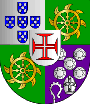 The arms are quartered the I Argent 5 escutcheons Azure arrayed crosswise each charged with 5 plates arrayed saltirewise and the II and III Vert a Catherine’s wheel Or and the IV Purpure five gems Argent arrayed saltirewise and in base a mitre Argent and issuant from the dexter base a crozier Argent and overall in abyss an escutcheon Argent a cross patty Gules charged with a cross couped Argent. Sérgio’s quoted blazon in Portuguese follows:
