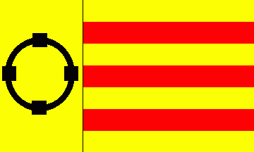 It is a 7-stripes banner with vertical alternating yellow and red stripes. It has a yellow bannerhead. In its centre is a black ring with four black squares.