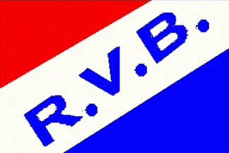 It is a red over white or blue flag divided per bend sinister. In the white stripe are dotted blue capital letters: "R.V.B."