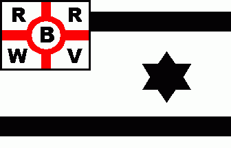 It is a white flag divided by a sinister bendy black over red over yellow ribbon. In the upper hoist corner are black capitals "RG" over "W", the "W" having double width.