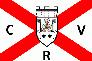 The white flag was parted by a blue centred cross. In the canton was a red cross patty flanked by red initials as follows: "E" (above hoist), "R" (above fly), "C" (below hoist) and "V" (below fly).