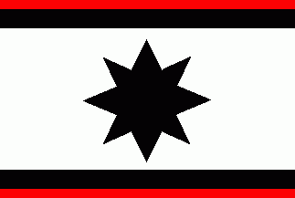 The white flag had connected red and black horizontal stripes at top and bottom with the red stripes on the edges. On centre was a big black 8-point star.