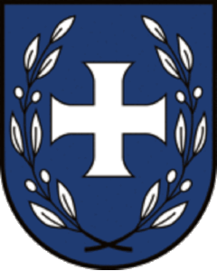 The coat of arms is shield-shaped, with a white (=silver) cross pattée (four equal arms) in the centre on a