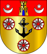 Nova Sintra arms - Of gold, an anchor in black, strung with silver, contained by three roses of the same, buttoned, streaked and encircled in red. In chief the arms of the town of Sintra without the cliffs.