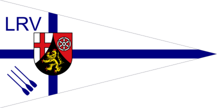 Te white pennant was parted by an off-centred blue cross. On its centre the arms of Rhineland-Palatinate. On upper host blue inscription "LRV" and on lower hoist three parallel blue oars in bend pointing downwards.