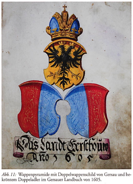 The oldest depiction¹ of the arms of Gersau is from 1605, in the so-called Landbuch, a collection of legal texts. In a source from 1711 the colours are depicted inversed; from 1742 on the colours have been depicted always in the present order. There is no source nor story about the origins of the colours red and blue.