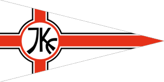 The white pennant is off-centred parted bya red cross cotized white-black. Shifted to hoist is a disc of the same with black inscription "JKC" with "J" for "I" and "K" piercing "C".